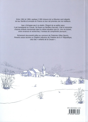 Des personnages fictifs, une histoire vraie, un récit documenté sur un chapitre peu reluisant de l'histoire de la Ve République : les enfants de la Creuse. Entre 1962 et 1984, quelque 2 000 mineurs de La Réunion sont séparés de leur famille et envoyés en France où leur est promise une vie meilleure. Jean n'échappe pas à ce destin. Eloigné de sa petite soeur, il est transplanté en Creuse. De foyers en familles d'accueil, il fait la rencontre d'autres enfants réunionnais dans la même situation que lui. Une vie durant, entre errances et recherches, il tentera de comprendre pourquoi... Richement documenté grâce au concours de l'historien Gilles Gauvin, Piments zoizos raconte un chapitre méconnu de l'histoire de la Ve République, celui des " enfants de la Creuse ".