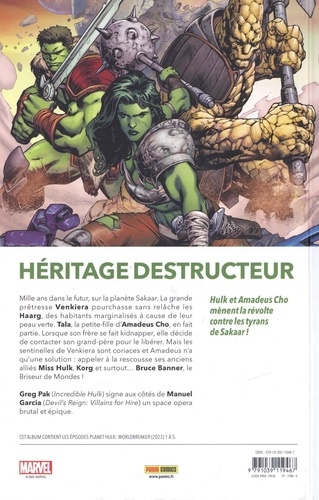 Mille ans dans le futur, sur la planète Sakaar : une jeune femme à la peau verte est à la recherche de la légendaire Balafre Verte qui est la seule à pouvoir sauver son frère d'une secte apocalyptique. Mais quel Hulk va-t-elle rencontrer ? Le Fils de Sakaar qui sauvera son peuple ou le Briseur de Mondes qui détruira tout ? Greg Pak, le scénariste de la saga très populaire Planète Hulk, est de retour dans ce monde qu'il a créé pour y raconter une histoire se déroulant dans un lointain futur. Au dessin, Manuel Garcia (Mystique) ! Un one-shot destiné aux nostalgiques de l'histoire originelle.