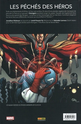 Le futur est devenu sombre suite aux événements d'Infinity. En plus d'une planète vagabonde qui risque de percuter la Terre et un groupe d'Avengers semblant surgir du passé, les plus Grands Héros de la Terre doivent également faire face à la trahison de l'un des leurs. Comment réagiront les Avengers face aux différents dangers qui les menacent ? Suite de la réédition en grand format de la prestation de Jonathan Hickman (House of X) sur les séries Avengers. Il est accompagné par deux dessinateurs emblématiques de l'écurie Marvel : Salvador Larroca (Dark Vador) et Leinil Francis Yu (X-Men).