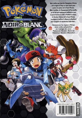 Les aventures de deux dresseurs talentueux dans la région d'Unys ! Noir réalise que tous les Champions de la région d'Unys se sont réunis pour contrer les plans de la Team Plasma. Mais Carolina, la Championne de l'Arène de Parsemille, ne lui fait pas totalement confiance et met le jeune homme au défi ! Pendant ce temps, le Trio des Ombres de la Team Plasma se prépare à infiltrer le Musée de Maillard pour récupérer le mystérieux Galet Noir... Découvrez la région d'Unys avec cette adaptation en manga des jeux Pokémon Version Noire et Pokémon Version Blanche !