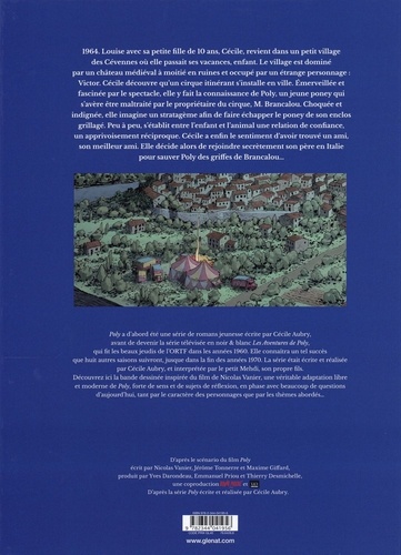 Une sublime histoire d'amitié. 1964. Louise, accompagnée de Cécile, sa petite fille de 10 ans, revient dans un petit village des Cévennes où elle passait ses vacances enfant. Le village est dominé par un château médiéval à moitié en ruines et occupé par un étrange personnage : Victor. Alors que Cécile peine à nouer des liens d'amitié avec ses nouveaux camarades, elle découvre qu'un cirque itinérant s'installe en ville. Emerveillée et fascinée par le spectacle, Cécile y fait la connaissance de Poly, un jeune poney qui s'avère être maltraité par le propriétaire du cirque, M. Brancalou. Choquée et indignée, elle imagine un stratagème pour libérer le poney de son enclos grillagé. Peu à peu, s'établit entre l'enfant et l'animal une relation de confiance, un apprivoisement réciproque. Cécile a enfin le sentiment d'avoir trouvé un ami, son meilleur ami. Tout le monde recherche Poly, les habitants du village, les gendarmes, et surtout M. Brancalou. Seul Victor finit par percer le secret de Cécile. Elle décide alors de rejoindre secrètement son père en Italie pour sauver Poly des griffes de Brancalou. Adaptation fidèle du livre (publié chez XO éditions) et du film de Nicolas Vanier (qui sort en même temps que la BD), Poly propose une bande dessinée en phase avec beaucoup de questions actuelles, tant par le caractère des personnages que par les thèmes abordés, notamment sur le rapport homme animal... D'après le scénario de Poly, le nouveau film de Nicolas Vanier, prochainement au cinéma, écrit par Nicolas Vanier, Jérôme Tonnerre et Maxime Giffard, produit par Yves Darondeau, Emmanuel Priou et Thierry Desmichelle, une coproduction Bonne Pioche et SND. D'après la série Poly, écrite et réalisée par Cécile Aubry.