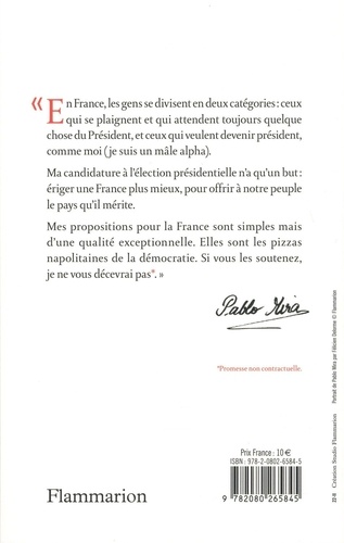 "France, les gens se divisent en deux catégories : ceux qui se plaignent et qui attendent toujours quelque chose du Président, et ceux qui veulent devenir président, comme moi (je suis un mâle alpha). Ma candidature à l'élection présidentielle n'a qu'un but : ériger une France plus mieux, pour offrir à notre peuple le pays qu'il mérite. Mes propositions pour la France sont simples mais d'une qualité exceptionnelle. Elles sont les pizzas napolitaines de la démocratie. Si vous les soutenez, je ne vous décevrai pas." Pablo Mira.