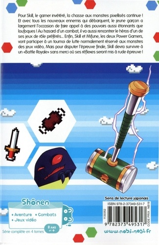 Pour Skill, le gamer invétéré, la chasse aux monstres pixellisés continue ! Et avec tous les nouveaux ennemis qui débarquent, le jeune garçon a largement l'occasion de faire appel à des pouvoirs aussi étonnants que loufoques ! Au hasard d'un combat, il va aussi rencontrer le héros d'un de ses jeux de rôle préférés... Enfin, Skill et Mifune, les deux Power Gamers, vont participer à un tournoi de lutte normalement réservé aux monstres des jeux vidéo. Mais pour disputer l'épreuve finale, Skill devra survivre à un "Battle Royale" sans merci où ses réflexes seront mis à rude épreuve ! Série complète en 4 tomes. A partir de 8 ans.