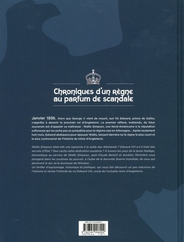 Chroniques d'un règne au parfum de scandale Janvier 1936. Alors que Georges V vient de mourir, son fils Edouard, prince de Galles, s'apprête à devenir le prochain roi d'Angleterre. Le premier réflexe, inattendu, du futur souverain est d'appeler sa maîtresse : Wallis Simpson, une nord-américaine à la réputation sulfureuse qui ne cache pas sa sympathie pour le régime nazi en Allemagne... Après seulement 8 mois, Edouard abdiquera pour épouser Wallis, laissant derrière lui le règne le plus court et le plus controversé de l'histoire du trône d'Angleterre. Wallis Simpson était-elle une espionne à la solde des Allemands ? Edouard VIII a-t-il trahi des secrets d'état ? Que cache cette abdication soudaine ? A travers les yeux de la jeune Nadège, domestique au service de Wallis Simpson, Jean-Claude Bartoll et Aurélien Morinière nous plongent dans les coulisses du pouvoir, à l'aube de la Seconde Guerre Mondiale. Un thriller d'espionnage, historique et politique, qui nous fait découvrir un pan méconnu de l'histoire et révèle l'intimité du roi Edouard VIII, oncle de l'actuelle reine d'Angleterre.
