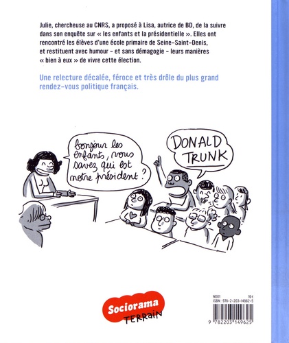 Julie, chercheuse au CNRS, a proposé à Lisa, autrice de la BD, de la suivre dans son enquête sur " les enfants et la présidentielle ". Elles ont rencontré les élèves d'une école primaire de Seine-Saint-Denis, et restituent avec humour - et sans démagogie - leurs manières " bien à eux " de vivre cette élection.