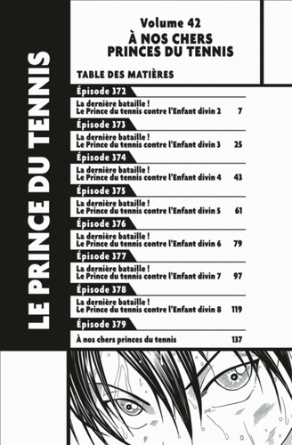Le championnat national est sur le point de se terminer. Avec deux victoires et deux défaites chacune, les deux équipes qui s’affrontent pour la finale ne comptent plus que sur leur dernier match en simple n°1. D’un côté, Ryôma qui porte le destin de son équipe et de l’autre, Yukimura que tout le monde appelle l’enfant divin. Le combat est sans pitié mais lequel des deux parviendra à dominer...?! Voici le dernier volume d’une oeuvre révolutionnaire qui a su mettre l’esprit sportif sur un piédestal !!