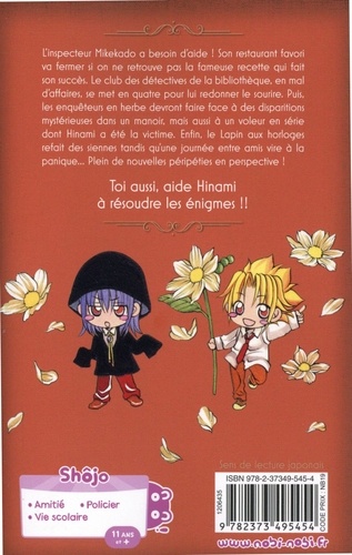 L'inspecteur Mikekado a besoin d'aide ! Son restaurant favori va fermer si on ne retrouve pas la fameuse recette qui fait son succès. Le club des détectives de la bibliothèque, en mal d'affaires, se met en quatre pour lui redonner le sourire. Puis, les enquêteurs en herbe devront faire face à des disparitions mystérieuses dans un manoir, mais aussi à un voleur en série dont Hinami a été la victime. Enfin, le Lapin aux horloges refait des siennes tandis qu'une journée entre amis vire à la panique... Plein de nouvelles péripéties en perspective ! Toi aussi, aide Hinami à résoudre les énigmes !!