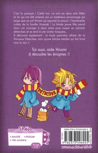 C'est la panique ! Cette fois, ce sont ses deux amis Rikka et Jin qui ont été enlevés par un mystérieux personnage qui exige que ce soit Hinami qui apporte la rançon : l'inestimable collier de la famille Umezaki ! La timide jeune fille prend donc son courage à deux mains pour sauver ses assistants détectives et se rend à une soirée masquée... A découvrir également : la toute première affaire de la Princesse Détective, ainsi qu'une histoire inédite qui fait froid dans le dos !! Toi aussi, aide Hinami à résoudre les énigmes !!