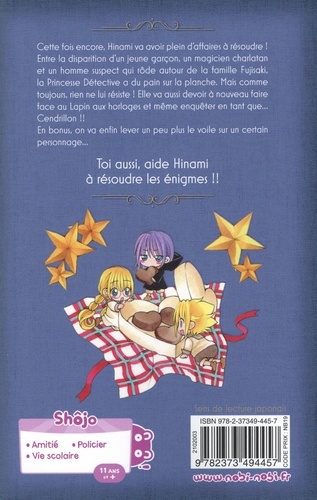 Cette fois encore, Hinami va avoir plein d'affaires à résoudre ! Entre la disparition d'un jeune garçon, un magicien charlatan et un homme suspect qui rôde autour de la famille Fujisaki, la Princesse Détective a du pain sur la planche. Mais comme toujours, rien ne lui résiste ! Elle va aussi devoir à nouveau faire face au Lapin aux horloges et même enquêter en tant que... Cendrillon !! En bonus, on va enfin lever un peu plus le voile sur un certain personnage... Toi aussi, aide Hinami à résoudre les énigmes !!