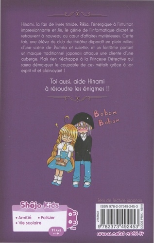 Hinami, la fan de livres timide, Rikka, l'énergique à l'intuition impressionnante et Jin, le génie de l'informatique discret se retrouvent à nouveau au coeur d'affaires mystérieuses. Cette fois, une élève du club de théâtre disparaît en plein milieu d'une scène de Roméo et Juliette, et un fantôme portant un masque traditionnel japonais attaque une cliente d'une auberge. Mais rien n'échappe à la Princesse Détective qui saura démasquer le coupable de ces méfaits grâce à son esprit vif et clairvoyant ! Toi aussi, aide Hinami à résoudre les énigmes !!