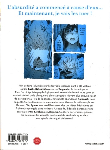 L'absurdité a commencé à cause d'eux... Et maintenant, je vais les tuer ! Afin de faire la lumière sur l'effroyable violence dont a été victime sa fille Sachi, Katsumata retrouve Tsugami et le force à parler. Mais Sachi, épuisée psychologiquement, se suicide devant leurs yeux en sautant du toit de la clinique où elle est soignée. N'ayant plus aucune raison de participer au "jeu de la prison", Katsumata abandonne Kuranashi dans sa geôle. Cette dernière commence alors une étonnante métamorphose... De son côté, Eyama veut se débarrasser des dernières hésitations qui freinent sa plongée dans le chaos. A cette fin, il décide d'organiser une entrevue entre Kirishima et Akiyama. Geôliers, partenaires, guides... les destins et les volontés continuent de s'entrechoquer dans une spirale de sang et de larmes !