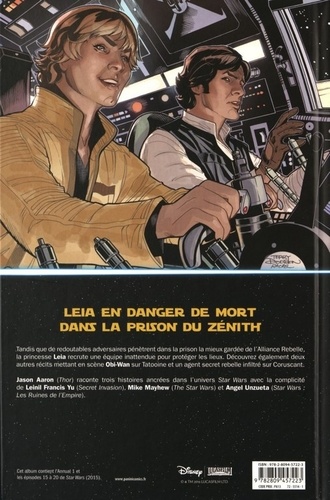 Tandis que de redoutables adversaires pénètrent dans la prison la mieux gardée de l'Alliance Rebelle, la princesse Leia recrute une équipe inattendue pour protéger les lieux. Découvrez également deux autres récits mettant en scène Obi-Wan sur Tatooine et un agent secret rebelle infiltré sur Coruscant. Jason Aaron (Thor) raconte trois histoires ancrées dans l'univers Star Wars avec la complicité de Leinil Francls Yu (Secret Invasion), Mike Mayhew (The Star Wars) et Angel Unzueta (Star Wars Les Ruines de l'Empire).