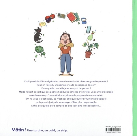 Est-il possible d'être végétarien quand on est invité chez ses grands-parents ? Peut-on faire du shopping en toute conscience écolo ? Dans quelle poubelle jeter son pot de yaourt ? Maïté Robert décortique ses petites habitudes et tente d'y instiller un souffle d'écologie avec beaucoup d'autodérision et, disons-le, un peu de mauvaise foi. On ne vous le cache pas, ce n'est pas elle qui sauvera l'humanité (quoique) mais promis juré, elle va essayer d'être plus responsable. Enfin, dès qu'elle aura compris ce que veut dire " responsable "...