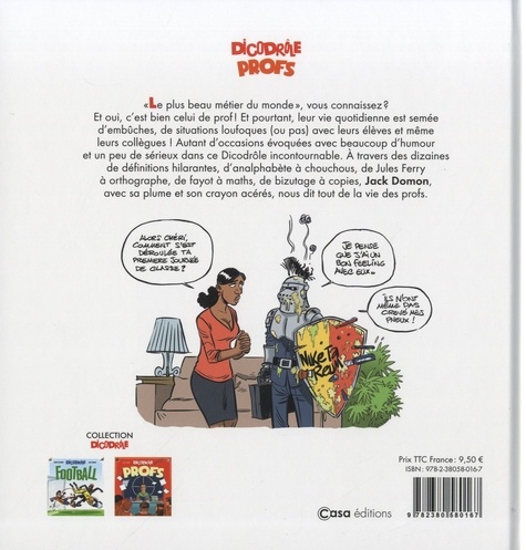 "Le plus beau métier du monde", vous connaissez ? Et oui, c'est bien celui de prof ! Et pourtant, leur vie quotidienne est semée d'embûches, de situations loufoques (ou pas) avec leurs élèves et même leurs collègues ! Autant d'occasions évoquées avec beaucoup d'humour et un peu de sérieux dans ce Dicodrôle incontournable. A travers des dizaines de définitions hilarantes, d'analphabète à chouchous, de Jules Ferry à orthographe, de fayot à maths, de bizutage à copies, Jack Domon, avec sa plume et son crayon acérés, nous dit tout de la vie des profs.