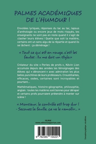 Palmes académiques de l'humour ! Envolées lyriques, réponses du tac au tac, lapsus d'anthologie ou encore jeux de mots risqués, les enseignants ne sont pas en reste quand il s'agit de clasher leurs élèves ! Quelle que soit la matière, certains ont un sens aigu de la répartie et quand ils se lâchent : ça déménage ! "Tout ce qui est rouge, c'est les fautes : tu me dois un stylo." Créateur du site " Perles de profs", Kévin Lion accumule depuis des années les témoignages des élèves qui "dénoncent" avec admiration les plus belles punchlines de leurs professeurs. Croustillantes, efficaces, osées, certaines sont incroyables et pourtant... Mathématiques, histoire-géographie, philosophie, anglais : toutes les matières sont bonnes pour déraper et certains profs pourraient prétendre à monter sur scène ! "Monsieur, le contrôle est trop dur ! - Secouez la feuille, ça va la ramollir..."