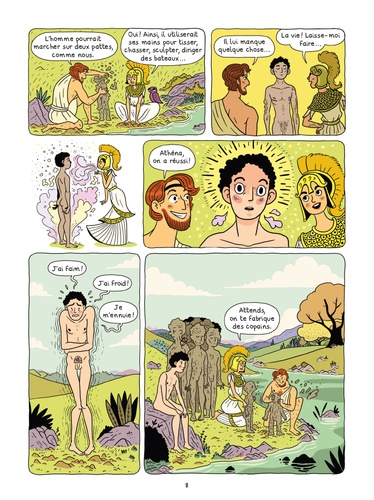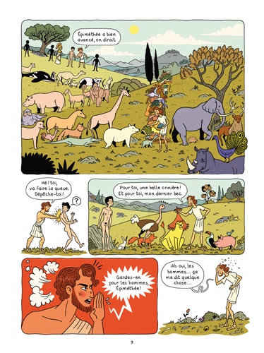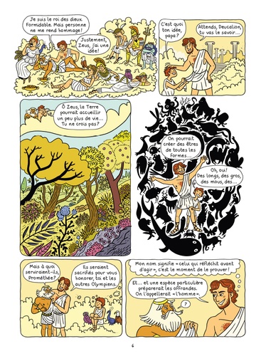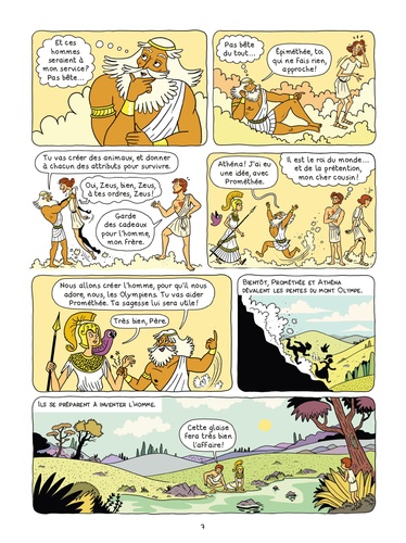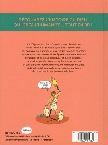 Pour tromper l'ennui qui gagne les dieux de l'Olympe, le titan Prométhée propose à Zeus de peupler la Terre. Avec des animaux, mais surtout des hommes, une espèce créée spécialement pour louer les dieux et leur faire des sacrifices ! Il leur apprend à chasser, à coudre, à écrire... mais aussi à maîtriser le feu, privilège des dieux. Pour contrer la terrible colère de Zeus, Prométhée subira le plus cruel des châtiments. Depuis la création des premiers hommes jusqu'au déluge en passant par la boîte de Pandore et le supplice de Prométhée, retrouvez tous les grands épisodes de cette histoire qui a inspiré auteurs et artistes à travers les siècles.