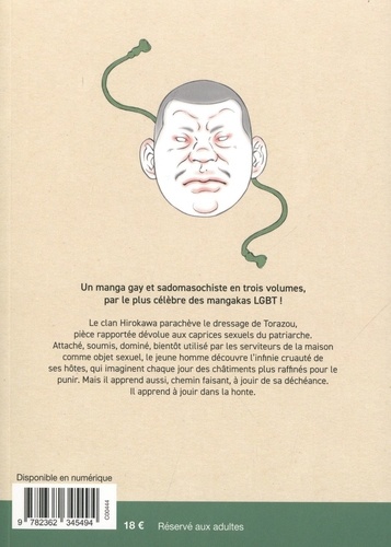 Le clan Hirokawa parachève le dressage de Torazou, pièce rapportée dévolue aux caprices sexuels du patriarche. Attaché, soumis, dominé, bientôt utilisé par les serviteurs de la maison comme objet sexuel, le jeune homme découvre l'infinie cruauté de ses hôtes, qui imaginent chaque jour des châtiments plus raffinés pour le punir. Mais il apprend aussi, chemin faisant, à jouir de sa déchéance. Il apprend à jouir dans la honte.