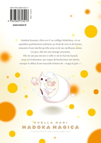Pour quel souhait serais-tu prête à sacrifier ton âme ? Madoka Kaname, élève en 4e au collège Mitakihara, vit un quotidien parfaitement ordinaire sur fond de rires et de larmes, entourée d'une famille qu'elle aime et de ses meilleures amies. Un jour, elle fait une étrange rencontre. Elle ne sait pas encore si celle-ci est le fruit du hasard, mais cet événement, qui risque de bouleverser son destin, marque le début d'une nouvelle histoire de " magical girls " ! La saga Madoka Magica enfin de retour en France !!!