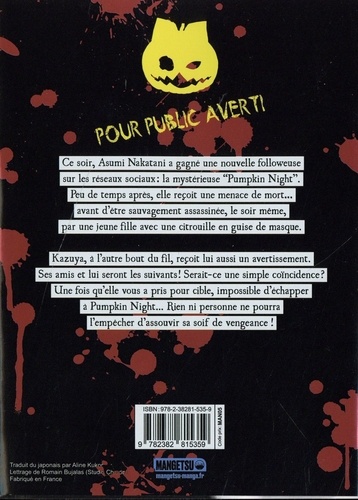 Ce soir, Asumi Nakatani a gagné une nouvelle followeuse sur les réseaux sociaux : la mystérieuse "Pumpkin Night". Peu de temps après, elle reçoit une menace de mort... avant d'être sauvagement assassinée, le soir même, par une jeune fille avec une citrouille en guise de masque. Kazuya, à l'autre bout du fil, reçoit lui aussi un avertissement. Ses amis et lui seront les suivants ! Serait-ce une simple coïncidence ? Une fois qu'elle vous a pris pour cible, impossible d'échapper à Pumpkin Night... Rien ni personne ne pourra l'empêcher d'assouvir sa soif de vengeance ! Un récit sanguinaire pour les amateurs de slasher movie, à ne pas mettre entre toutes les mains !
