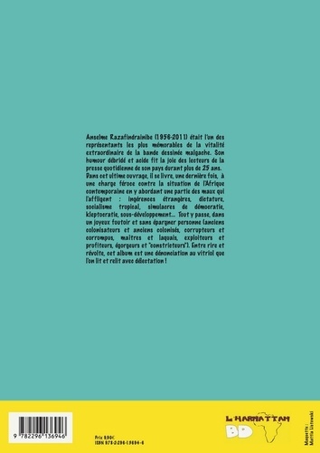Anselme Razafindrainibe (1956-2011) était l’un des représentants les plus mémorables de la vitalité extraordinaire de la bande dessinée malgache. Dans cet ultime ouvrage, il se livre à une charge féroce contre la situation de l’Afrique contemporaine en y abordant une partie des maux qui l’affligent : ingérences étrangères, dictature, socialisme tropical, simulacres de démocratie, kleptocratie, sous-développement... Entre rire et révolte, cet album est une dénonciation au vitriol !