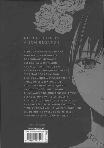 Afin de prouver que Nanami Jôgasaki, la présidente des éditions Stephanie, est coupable d'évasion fiscale, Riko Rinda s'y fait engager en tant que deuxième secrétaire de rédaction. Elle commence à s'impatienter parce qu'elle n'arrive pas à trouver de preuves, quand, la nuit de Noël, un diamant d'une valeur de cinq cent mille yens est volé. Riko va-t-elle réussir à faire la lumière sur cette affaire ? En parallèle, sa relation avec Yûto semble enfin évoluer. ainsi se tournent les dernières pages de cette belle aventure pleine de mystère(s) !
