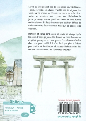 La vie au collège n'est pas de tout repos pour Nishikata : Takagi, sa voisine de classe, n'arrête pas de lui jouer des tours. Sur le chemin de l'école, en cours, ou à la récré, toutes les occasions sont bonnes pour déstabiliser le jeune garcon qui rêve de prendre sa revanche, mais échoue continuellement ! Il faut dire aussi qu'il est bien difficile de rester concentré face au sourire malicieux de cette petite diablesse. Nishikata et Takagi sont encore de corvée de ménage après les cours. l'espiègle jeune fille trouve par hasard un carton rempli de perruques de toute genre. Pour chacune d'entre elles, une personnalité ! Il n'en faut pas plus à Takagi pour profiter de la situation et pousser Nishikata dans les derniers retranchements de l'embarras amoureux !