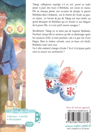 Takagi, collégienne espiègle s'il en est, prend un malin plaisir à jouer des tours à Nishikata, son voisin en classe. Elle ne manque jamais une occasion de plonger le pauvre Nishikata dans l'embarras : sur le chemin de l'école, au parc, en classe... Le terrain de jeu de Takagi est sans limite, au grand désespoir de Nishikata qui ne résiste ni aux blagues de la jeune fille, ni à son petit sourire ravageur ! Décidément, Takagi ne se lasse pas de taquiner Nishikata. Pourtant, lorsqu'elle lui annonce qu'elle va déménager après les vacances d'été, le mois prochain, cela n'a pas l'air d'une blague. Dans la chaleur estivale, sous un beau ciel étoilé, Nishikata reste sans voix. Va-t-elle vraiment changer d'école ? Va-t-il la laisser partir sans lui avouer ses sentiments ?