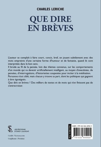 L'auteur se complaît à faire court, concis, bref, en jouant subtilement avec des mots empreints d'une certaine forme d'humour et de fantaisie, quand ils sont interprétés dans le bon sens. Il brode au fil de la pensée, loin des thèmes convenus, sur les comportements d'un monde qui va devenir artificiellement intelligent, au moyen d'anecdotes, de pensées, d'interrogations, d'historiettes soupesées pour inciter à la méditation. Personne n'est ciblé, mais chacun y trouve sa part, dont les politiques qui gagnent à être égratignés. Que dire en brèves ? Des milliers de textes et de mots qui n'en finissent pas de s'entrecroiser.