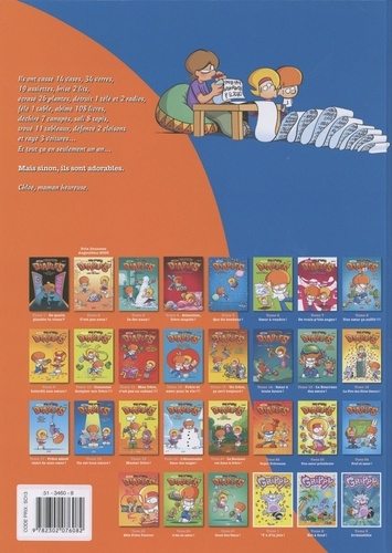 Ils ont cassé 14 vases, 34 verres, 19 assiettes, brisé 2 lits, écrasé 26 plantes, détruit 1 télé et 2 radios, fêlé 14 table, abîmé 108 livres, déchiré 7 canapés, sali 8 tapis, troué 11 tableaux, défoncé 2 cloisons et rayé 3 voitures... Et tout ça en seulement un an... Mais sinon, ils sont adorables. Chloé, maman heureuse.