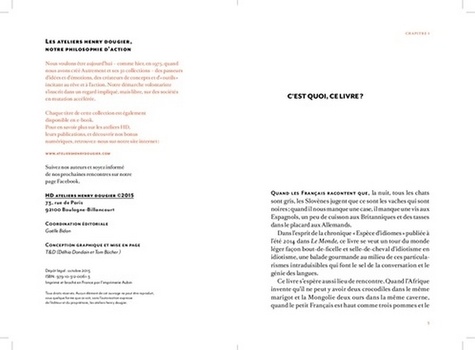 Voyagez à travers les expressions du monde " Que votre moustache pousse comme la broussaille ! " Quand les Français racontent que, la nuit, tous les chats sont gris, les Slovènes jugent que ce sont les vaches qui sont noires ; quand il nous manque une case, il manque une vis aux Espagnols, un peu de cuisson aux Britanniques et des tasses dans le placard aux Allemands. Dans l'esprit de la chronique " Espèces d'idiomes " publiée par Muriel Gilbert à l'été 2014 dans Le Monde, ce livre est un tour du monde léger façon bout-de-ficelle et selle-de-cheval d'idiotisme en idiotisme, une balade gourmande au milieu de ces particularismes intraduisibles qui font le sel de la conversation et le génie des langues.
