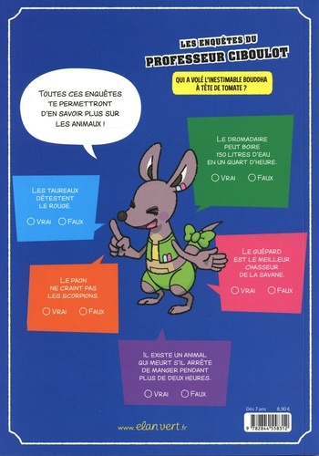 Qui a volé l'inestimable Bouddha à la tête de tomate ? Le dromadaire peut boire 150 litres d'eau en un quart d'heure (vrai-faux). Les taureaux détestent le rouge (vrai-faux). Le guépard est le meilleur chasseur de la savane (vrai-faux). Le paon ne craint pas les scorpions (vrai-faux). Il existe un animal qui meurt s'il arrête de manger plus de deux heures (vrai-faux). Toutes ces enquêtes te permettront d'en savoir plus sur les animaux !