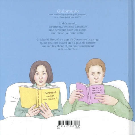 Un quiproquo est une méprise par laquelle une chose est prise pour une autre. Dorénavant, au pluriel, c'est un recueil de gags qui ne se prennent pas pour autre chose que des gags à l'humour irrésistible. Comprendre de travers, n'entendre que ce qu'on a envie d'entendre, nul n'y échappe. Quiproquos est un livre qui s'amuse à nous tendre un miroir. De malcomprenants en malentendus, l'absurde s'invite soudain dans la réalité en quelques mots. D'une mécanique classique de comédie, Constance Lagrange parvient à décliner plus de cent gags et à nous surprendre à chaque fois dans un grand éclat de rire.