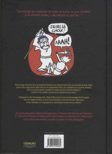 Petite frange extrémiste de la communauté Starouars, les Jedistes vivent selon les préceptes de leurs idoles, quitte à faire usage de leur sabre laser sur les populations civiles, ou à combattre sur la planète Tatooline. Qu'est-ce qui les pousse à prendre les armes dans des contrées lointaines ? Finiront-ils par prendre conscience de la portée de leurs actes ? S'appuyant sur des témoignages réels, Radical Wars met en scène des personnages fictifs engagés dans une logique violente, et nous livre de véritables confessions brutes, didactiques et sans idéologie sur le pourquoi de la radicalisation violente de ces Jedistes. Un carnet pédagogique rédigé par Séraphin Alava, Professeur des Sciences de l'Education à l'Université de Toulouse et membre de la Chaire Unesco en prévention de la radicalisation et de l'extrémisme violents, complète cet album de façon pédagogique.