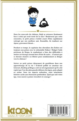 Le parcours riche en émotions et en aventures d'un petit prince sourd-muet à la conquête du monde ! Miranjo a fomenté l'assassinat de la précédente reine... et, désormais aidée d'Apeas, celui de Hiling ! Heureusement, le brave Dorshe est prêt à donner sa vie pour la protéger. Mais, malgré sa robustesse hors du commun, le garde royal a bien du mal à repousser l'assaut conjoint des monstres sanguinaires et des criminels échappés des geôles des Enfers... De leur côté, le prince Bojji et les chevaliers de Desha sont en route pour secourir le royaume. Seulement, pour l'atteindre, il leur faudra se débarrasser du redoutable Ouken, la fine lame diabolique... Suivez un petit prince désarmant de gentillesse dans son apprentissage de la vie ! D'abord publié en amateur sur Internet, Ranking of Kings a créé un tel engouement qu'il a été repéré par l'un des plus grands éditeurs du Japon, puis adapté en anime. Sous ses aspects enfantins, cette attachante histoire cache une étonnante profondeur. Quel que soit votre âge, vous saurez y puiser réconfort et courage !