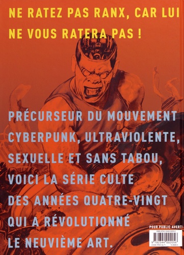 Punk, trash, vintage. Et en grand format ! Ranx est un colosse dans un monde de brutes. Ranx est un robot entouré d'humains. Depuis un malencontreux court-circuit, il est victime d'un simili-sentiment amoureux pour une petite peste de 12 ans shootée en permanence et au caractère exécrable, Lubna. Pour lui trouver de la drogue, se débarrasser de ses amants, lui faire plaisir, Ranx ira du massacre collectif à la performance au music-hall. Ranx n'a peur de rien, et surtout pas du ridicule. Au-delà de la provocation et du défoulement libérateur, ne cherchez pas de sens à ces histoires épiques : elles sont un prétexte pour que vous explose en pleine figure une dose létale de cyberpunk, d'ultra violence crue et d'érotisme, dans une espèce de parodie du monde moderne, de sa perdition dans la consommation et l'égoïsme. Retrouvez enfin ce monument de la bande dessinée trash (lauréat du prix Alfred presse à Angoulême en 1983) dans une intégrale grand format, idéale pour apprécier la puissance de l'incroyable dessin hyper réaliste de Liberatore. Ne ratez pas Ranx, car lui ne vous ratera pas !