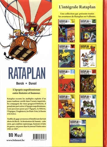 L'épopée napoléonienne entre histoire et humour. Rataplan raconte les multiples exploits d'un jeune tambour enrôlé dans l'armée impériale. En compagnie du vieux grognard Bobèche, il prend une part active à l'épopée napoléonienne. Leur parcours passe par l'Egypte, la Sibérie, l'Espagne, l'Angleterre, les Etats-Unis, la Russie et la Grèce. Truffée de gags savoureux et bénéficiant du trait alerte de Berck - le dessinateur de Sammy - cette série, qui combine espionnage, humour et faits de guerre, est parue dans le journal Tintin entre 1961 et 1967.