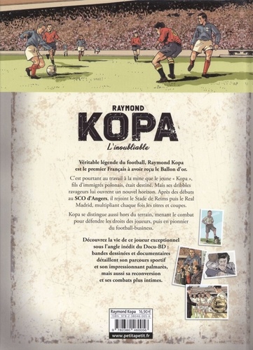 Véritable légende du football, Raymond Kopa est le premier Français à avoir reçu le Ballon d'or. C'est pourtant au travail à la mine que le jeune "Kopa", fils d'immigrés polonais, était destiné. Mais ses dribbles ravageurs lui ouvrent un nouvel horizon. Après des débuts au SCO d'Angers, il rejoint le Stade de Reims puis le Real Madrid, multipliant chaque fois les titres et coupes. Kopa se distingue aussi hors du terrain, menant le combat pour défendre les droits des joueurs, puis en pionnier du football-business. Découvrez la vie de ce joueur exceptionnel sous l'angle inédit du Docu-BD bandes dessinées et documentaires détaillent son parcours sportif et son impressionnant palmarès, mais aussi sa reconversion et ses combats plus intimes.