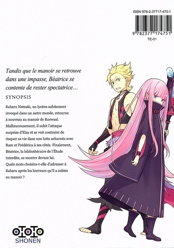 Tandis que le manoir se retrouve dans une impasse, Béatrice se contente de rester spectatrice... Subaru Natsuki, un lycéen subitement invoqué dans un autre monde, retourne à nouveau au manoir de Roswaal. Malheureusement, il subit l'attaque surprise d'Elsa et se voit contraint de risquer sa vie dans une lutte acharnée avec Ram et Frédérica à ses côtés. Finalement, Béatrice, la bibliothécaire de l'Etude interdite, se montre devant lui. Quels mots choisira-t-elle d'adresser à Subaru après les horreurs qu'il a subies au manoir ?