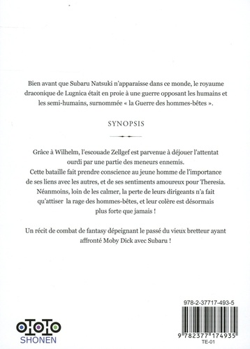 Bien avant que Subaru Natsuki n'apparaisse dans ce monde, le royaume draconique de Lugnica était en proie à une guerre opposant les humains et les semi-humains, surnommée "la Guerre des hommes-bêtes". Synopsis : Grâce à Wilhelm, l'escouade Zellgef est parvenue à déjouer l'attentat ourdi par une partie des meneurs ennemis. Cette bataille fait prendre conscience au jeune homme de l'importance de ses liens avec les autres, et de ses sentiments amoureux pour Theresia. Néanmoins, loin de les calmer, la perte de leurs dirigeants n'a fait qu'attiser la rage des hommes-bêtes, et leur colère est désormais plus forte que jamais ! Un récit de combat de fantasy dépeignant le passé du vieux bretteur ayant affronté Moby Dick avec Subaru !
