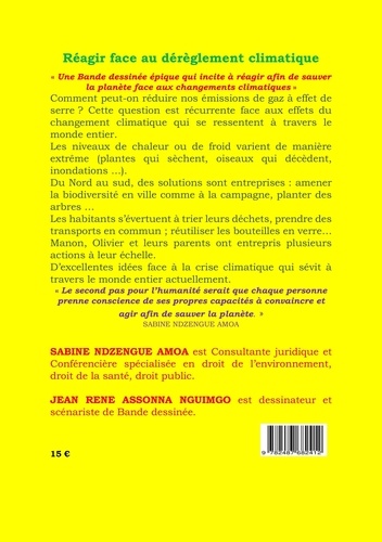 "Une Bande dessinée épique qui incite à réagir afin de sauver la planète face aux changements climatiques" Comment peut-on réduire nos émissions de gaz à effet de serre ? Cette question est récurrente face aux effets du changement climatique qui se ressentent à travers le monde entier. Les niveaux de chaleur ou de froid varient de manière extrême (plantes qui sèchent, oiseaux qui décèdent, inondations ...). Du Nord au sud, des solutions sont entreprises : amener la biodiversité en ville comme à la campagne, planter des arbres ... Les habitants s'évertuent à trier leurs déchets, prendre des transports en commun ; réutiliser les bouteilles en verre... Manon, Olivier et leurs parents ont entrepris plusieurs actions à leur échelle. D'excellentes idées face à la crise climatique qui sévit à travers le monde entier actuellement. "Le second pas pour l'humanité serait que chaque personne prenne conscience de ses propres capacités à convaincre et agir afin de sauver la planète". SABINE NDZENGUE AMOA