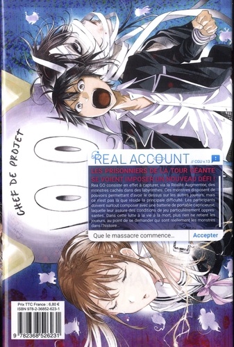 Quand les réseaux sociaux prennent le contrôle de votre destin ! Avec Real Account , vous ne pourrez plus tricher sans le payer de votre vie ! Au nombre de 28, les prisonniers de la tour géante bâtie par les hommes de Real Account se voient imposer un nouveau défi au principe très ludique. Rea GO consiste en effet à capturer, via la Réalité Augmentée, des monstres cachés dans des labyrinthes. Ces monstres disposent de pouvoirs permettant d'avoir le dessus sur les autres joueurs, mais ce n'est pas là que réside la principale difficulté. Les participants doivent surtout composer avec une batterie de portable capricieuse, laquelle leur assure des conditions de jeu particulièrement oppressantes. Dans cette lutte à la vie à la mort, plus rien ne retient les joueurs, au point de se demander qui sont réellement les monstres dans l'histoire...