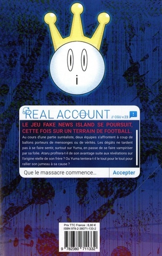 Le jeu Fake News Island se poursuit, cette fois sur un terrain de football. Au cours d'une partie surréaliste, deux équipes s'affrontent à coup de ballons porteurs de mensonges ou de vérités. Les dégâts ne tardent pas à se faire sentir, surtout sur Varna, en passe de se faire vampiriser par sa folie. Ataru profitera-t-il de son avantage suite aux révélations sur l'origine réelle de son frère ? Ou Yuma tentera-t-il le tout pour le tout pour rallier son jumeau à sa cause ? Que le massacre commence...