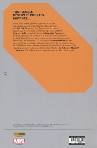 Tout semble désespéré pour les mutants... Alors que notre planète agonise, tous les espoirs reposent à présent sur la station spatiale du S.W.O.R.D. et sur son fameux Protocole V... Quant aux X-Men, cela fait longtemps que Darwin, Synch et X-23 ont pénétré dans la Chambre Forte pour en savoir plus sur les humains à la pointe de l'évolution qui y vivent. Cela dit, il est grand temps de comprendre pourquoi la mission s'est éternisée... A Madripoor, les Maraudeurs nouent des relations avec Krakoa et les autres nations du monde, non sans se faire de nouveaux ennemis rongés par de vieilles rancunes. Enfin, après plusieurs missions fatales sous l'égide de X-Force, Quentin Quire se lance dans une nouvelle vie qu'il espère plus longue...