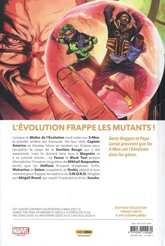 Lorsque le Maître de l'évolution rend visite aux X-Men, la planète entière est menacée. De leur côté, Captain America et d'autres héros se rendent sur Krakoa pour récupérer le corps de la Sorcière Rouge qui a été assassinée, mais ils doivent faire face à Magnéto et sa volonté d'acier... Le Fauve et Black Tom tentent d'empêcher l'invasion singulière de Mikhail Raspoutine, tandis que les Hellions finissent d'imploser. Enfin, Wolverine et Solem coopèrent, et Orchis attend le bon moment pour frapper les stations du S.W.O.R.D. dirigées par Abigail Brand, qui reçoit l'impératrice shi'ar, Xandra. Gerry Duggan et Pepe Larraz prouvent que les X-Men ont l'héroïsme dans les gènes.