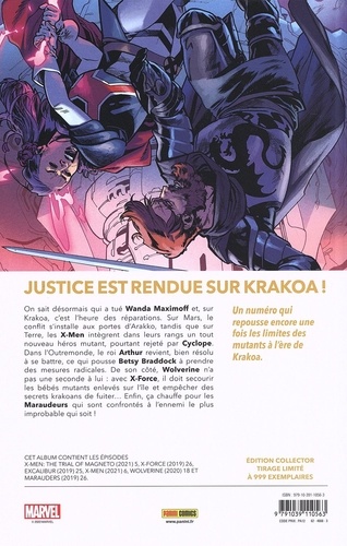 On sait désormais qui a tué Wanda Maximoff et, sur Krakoa, c'est l'heure des réparations. Sur Mars, le conflit s'installe aux portes d'Arakko, tandis que sur Terre, les X-Men intègrent dans leurs rangs un tout nouveau héros mutant, pourtant rejeté par Cyclope. Dans l'Outremonde, le roi Arthur revient, bien résolu à se battre, ce qui pousse Betsy Braddock à prendre des mesures radicales. De son côté, Wolverine n'a pas une seconde à lui : avec X-Force, il doit secourir les bébés mutants enlevés sur file et empêcher des secrets krakoans de fuiter... Enfin, ça chauffe pour les Maraudeurs qui sont confrontés à l'ennemi le plus improbable qui soit !
