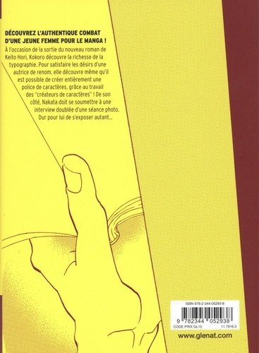 A l'occasion de la sortie du nouveau roman de Keito Hori, Kokoro découvre la richesse de la typographie. Pour satisfaire les désirs d'une autrice de renom, elle découvre même qu'il est possible de créer entièrement une police de caractères, grâce au travail des "créateurs de caractères" ! De son côté, Nakata doit se soumettre à une interview doublée d'une séance photo. Dur pour lui de devoir s'exposer autant...
