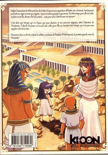 Malgré l'assassinat de Néférourê lors de la fête d'Opet et une séparation définitive avec Senmout, Hatchepsout poursuit son règne en tant que régente. Après 16 années passées à gouverner, il va être temps pour elle de céder sa place à son fils, devenu chef des armées... mais pour cela, il doit trouver une épouse ! C'est alors que Meryet, lui n'a d'yeux que pour pharaon et son parcours atypique, attire l'attention de Thoutmosis : il décide de passer un accord avec cette jeune fille au caractère bien trempé, qui n'est pas sans rappeler celui de la reine... Découvrez dans ce dernier volume la sublime conclusion de l'histoire d'Hatchepsout, la première grande reine de l'humanité !