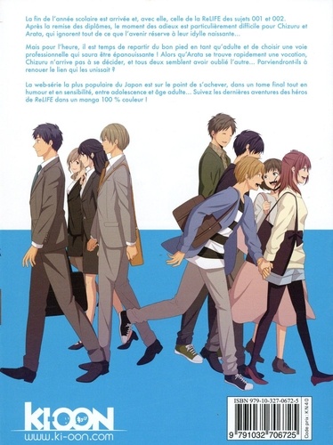 La fin de l'année scolaire est arrivée et, avec elle, celle de la ReLIFE des sujets 001 et 002. Après la remise des diplômes, le moment des odieux est particulièrement difficile pour Chizuru et Arata, qui ignorent tout de ce que l'avenir réserve à leur idylle naissante... Mais pour l'heure, il est temps de repartir du bon pied en tant qu'adulte et de choisir une voie professionnelle qui saura être épanouissante ! Alors qu'Areta se trouve rapidement une vocation, Chizuru n'arrive pas à se décider, et tous deux semblent avoir oublié l'autre... Parviendront-ils à renouer le lien qui les unissait ? La web-série la plus populaire du Japon est sur le point de s'achever, dans un tome Final tout en humour et en sensibilité, entre adolescence et âge adulte... Suivez les dernières aventures des héros de ReLIFE dans un manga 100 % couleur !