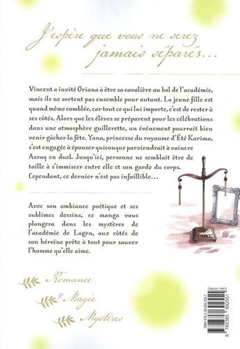 Vincent a invité Oriana à être sa cavalière au bal de l'académie, mais ils ne sortent pas ensemble pour autant. La jeune fille est quand même comblée, car tout ce qui lui importe, c'est de rester à ses côtés. Alors que les élèves se préparent pour les célébrations dans une atmosphère guillerette, un événement pourrait bien venir gâcher la fête. Yana, princesse du royaume d'Eté Karima s'est engagée à épouser quiconque parviendrait à vaincre Azraq en duel. Jusqu'ici, personne ne semblait être de taille à s'immiscer entre elle et son garde du corps. Cependant, ce dernier n'est pas infaillible... Avec son ambiance poétique et ses sublimes dessins, ce manga vous plongera dans les mystères de l'académie de Lagen, aux côtés de son héroïne prête à tout pour sauver l'homme qu'elle aime.