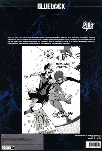 DES REPRODUCTIONS DE PLANCHES ORIGINALES POUR AFFICHER VOTRE FAN ATTITUDE AVEC STYLE ! Facsimilée des planches originales, chaque reproduction représente une scène emblématique de la série, issue du tome 16 du manga Blue Lock. Imprimée sur un papier épais, de qualité et au format 30 x 40cm, elle pourra être encadrée ou vous pourrez la conserver dans son étui. Chaque étui indique la provenance de la planche dans la série et également une impression de la version française de la planche : vous pourrez ainsi vous amuser à surprendre vos ami·e·s ! Informations techniques : Une reproduction de planche d'une scène mythique du manga Blue Lock issue du tome 16, avec le texte japonais (traduit en français sur le packaging) Format : 30 x 40 cm, haute qualité d'impression